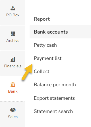 You can find the payment list by going to Bank and then selecting Overview – Payment list from the submenu.