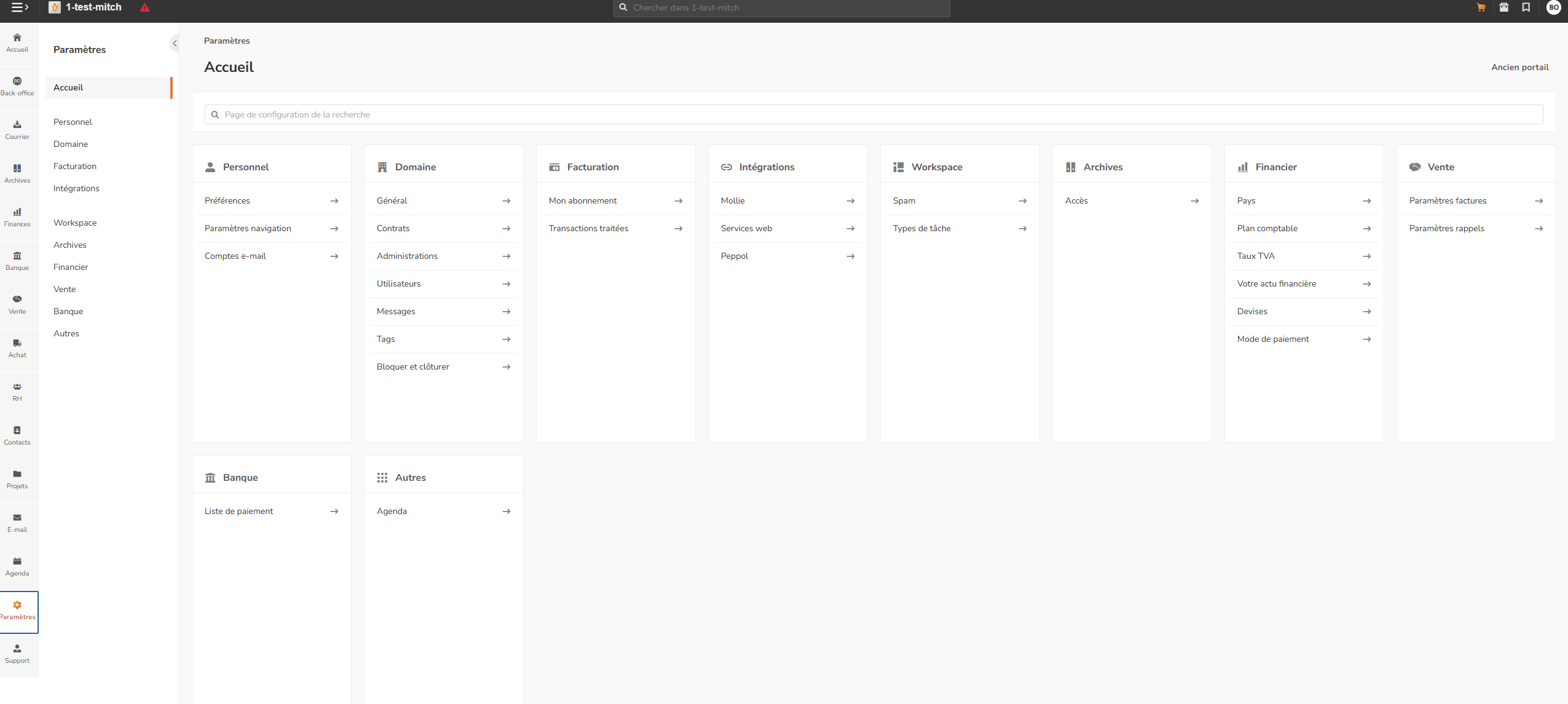 Dans le menu des paramètres, vous pouvez gérer le domaine de votre environnement Yuki.