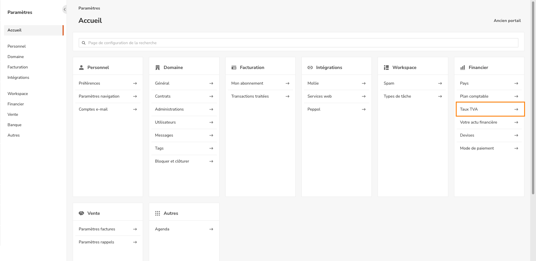 Cliquez sur Paramètres en ensuite sur Taux TVA.