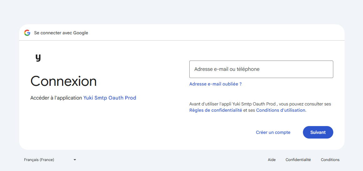 - Une notification apparaît vous demandant d’accorder l’autorisation à Yuki Smtp Oauth Prod pour faire confiance à votre compte. Cliquez sur Continuer pour accepter.