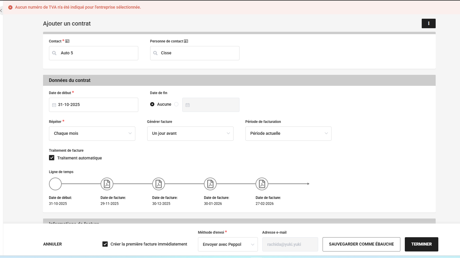 Attention : Si vous choisissez « via Peppol » comme méthode d’envoi et qu’aucun numéro de TVA n’est renseigné dans la fiche du client, un message d’erreur apparaîtra en haut de l’écran.