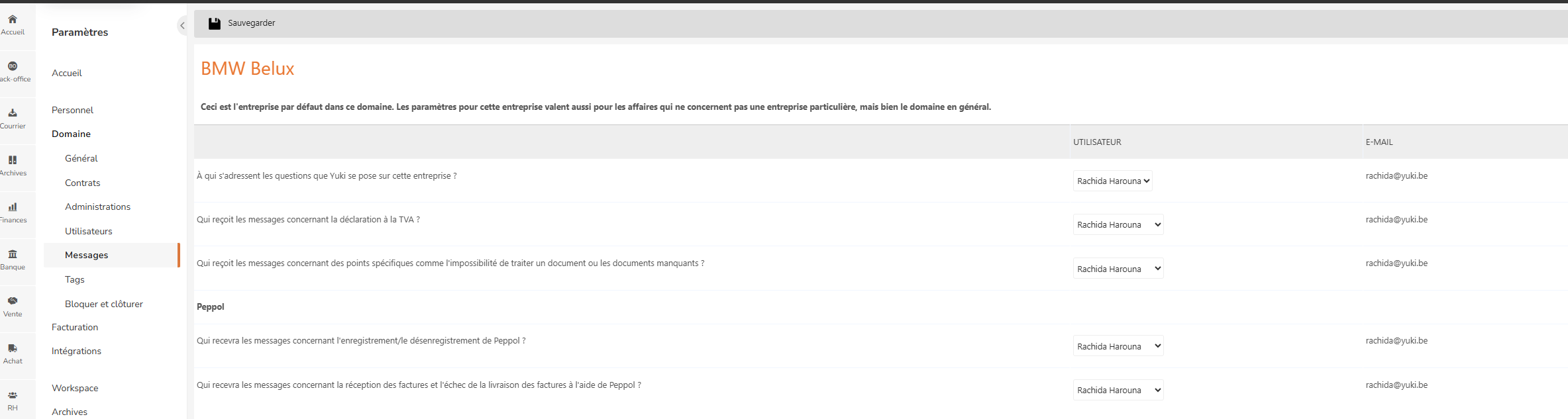 La tâche est attribuée à la personne définie dans Paramètres > Messages, sous la rubrique Peppol. Celle-ci peut être modifiée (uniquement par l’entrepreneur) pour être assignée à un autre utilisateur si nécessaire.