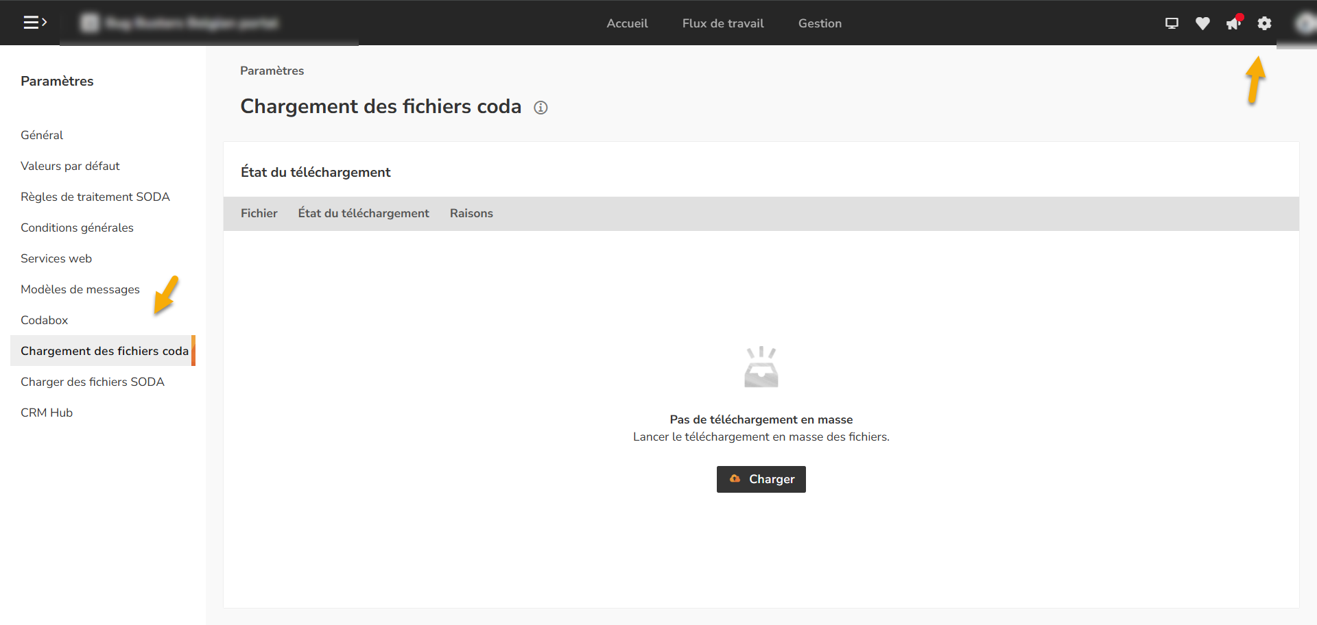 Cette fonctionnalité est uniquement accessible aux utilisateurs ayant le rôle de Administrateur du portail et Portail back-office. Dans le portail, par Paramètres , Charger des fichiers coda, vous pouvez charger les fichiers coda , qui seront ensuite répartis dans les différents domaines.