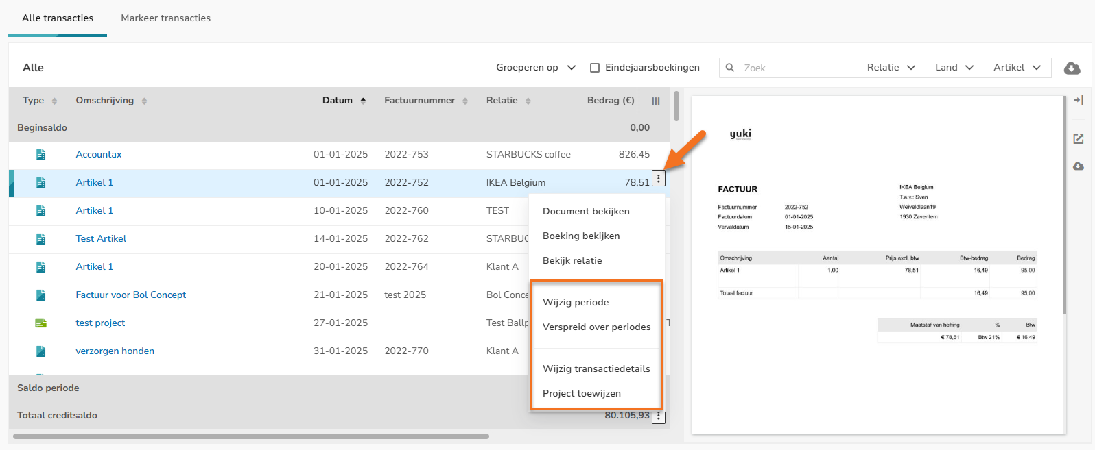 Beweeg met je muis boven de regel van de desbetreffende factuur of banktransactie en klik op de knop met de drie puntjes. Selecteer vervolgens Wijzig periode in het dropdownmenu.