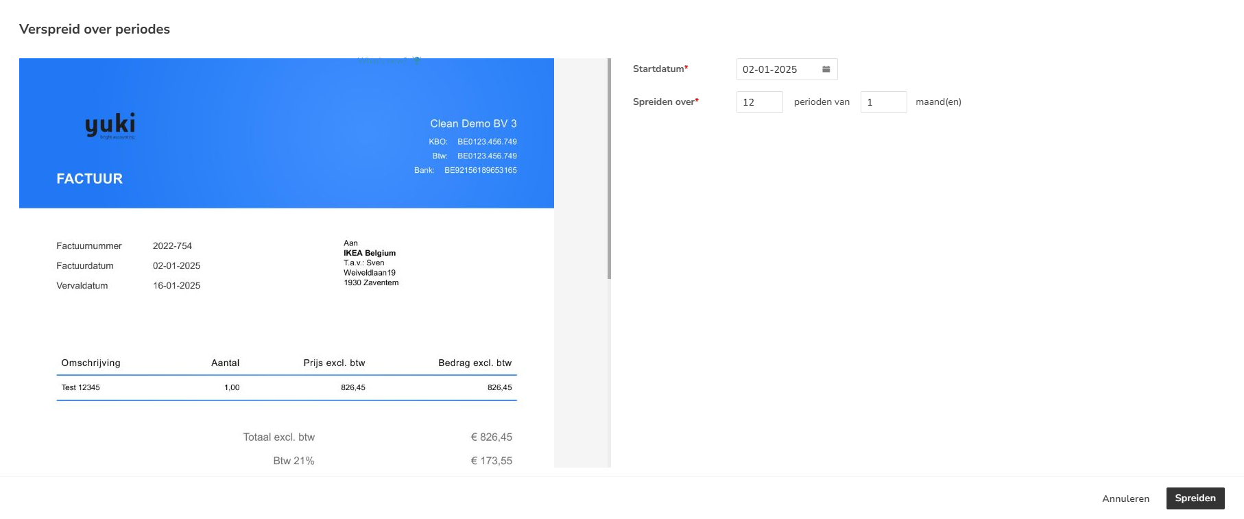 Voer de startdatum in en geef vervolgens aan hoe de kosten of omzet gespreid moeten worden. Klik vervolgens op de knop Spreiden.