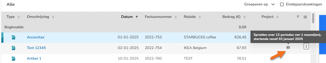 Beweeg met je muis boven de regel van de desbetreffende factuur en klik op de knop met de drie puntjes. Selecteer vervolgens Verspreid over periodes in het dropdownmenu.