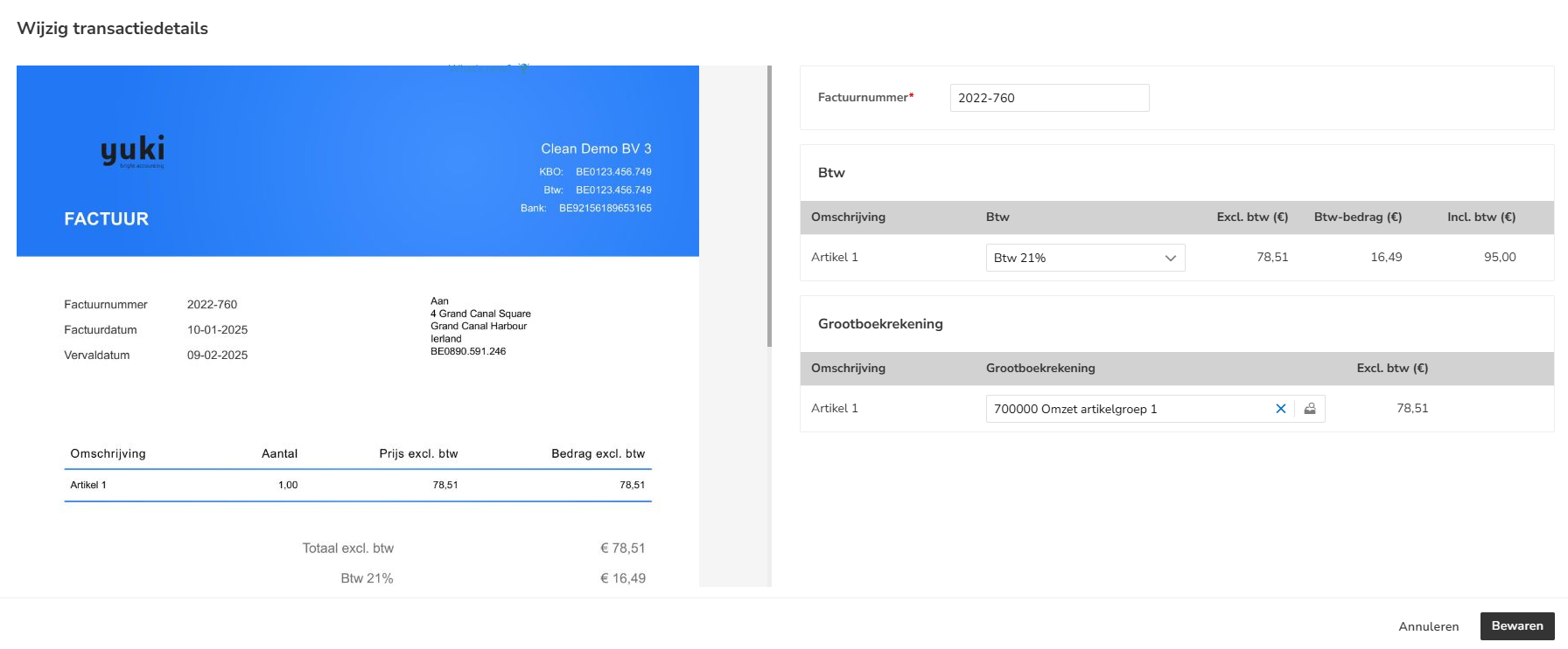 Wijzig het factuurnummer, de btw-code en/of de grootboekrekening en klik vervolgens op de knop Bewaren.