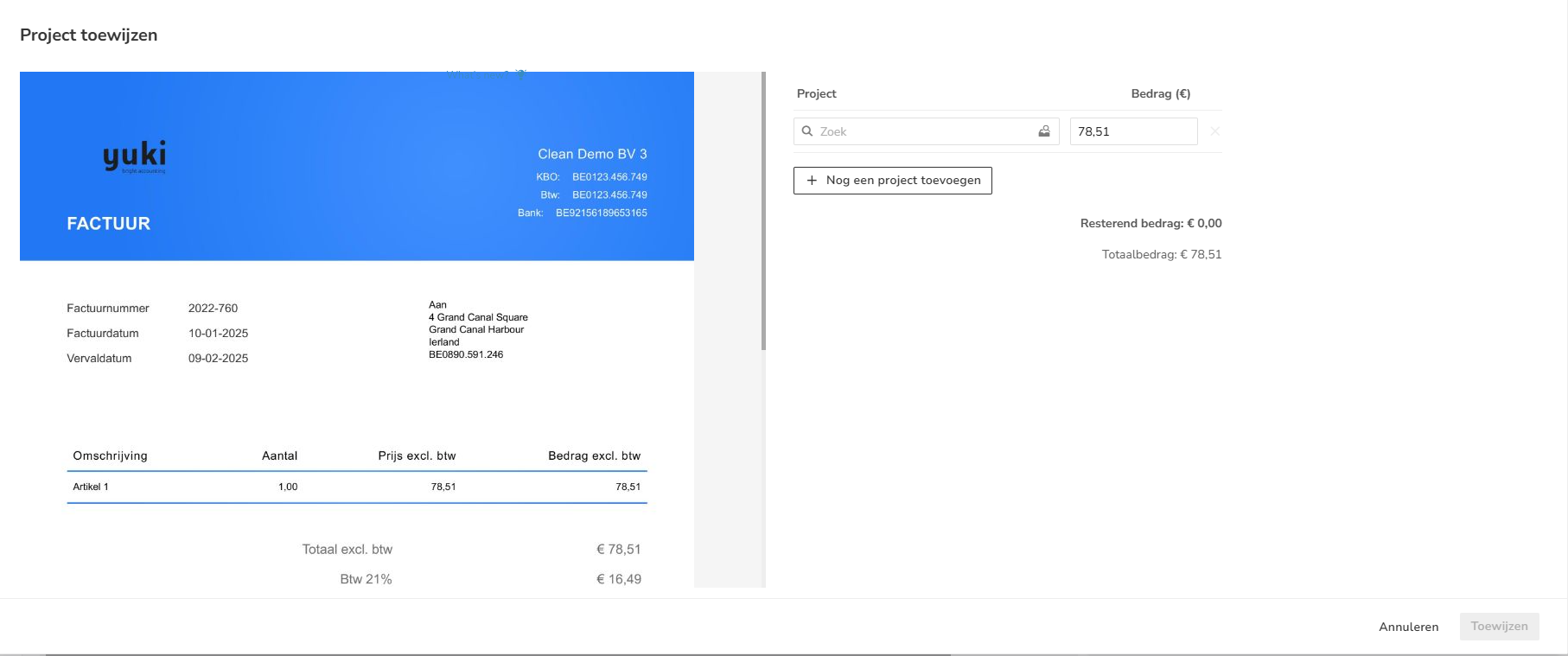 Een factuur kan worden toegewezen aan een project.
