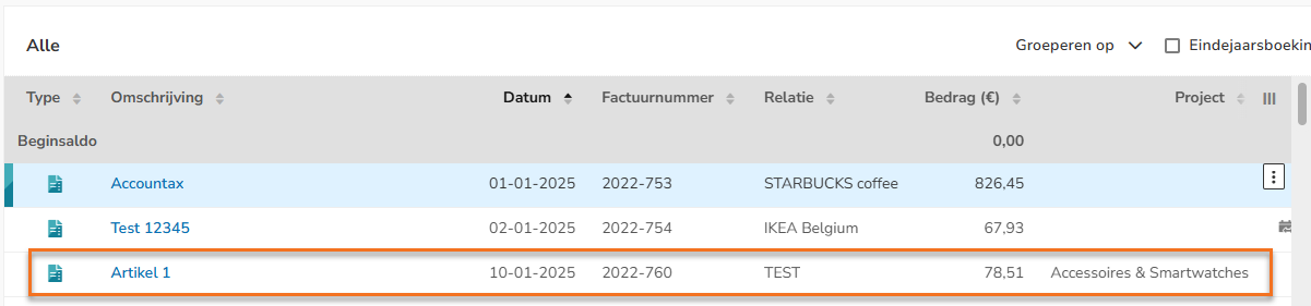 In het scherm wordt nu in de kolom 'Project' het aan de factuur toegewezen project getoond:
