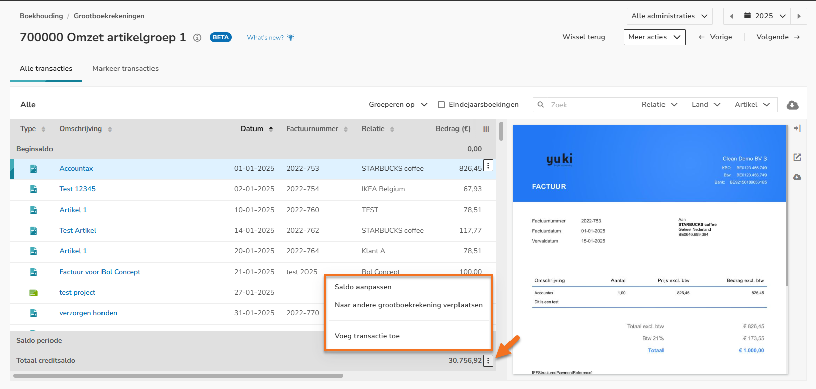 Om gebruik te maken van de nabewerkingsfuncties voor een grootboekrekening, klik je op de knop met de drie puntjes achter het totaal saldo van de grootboekrekening en selecteer je in het dropdownmenu de nabewerkingsfunctie die je wilt gaan gebruiken: