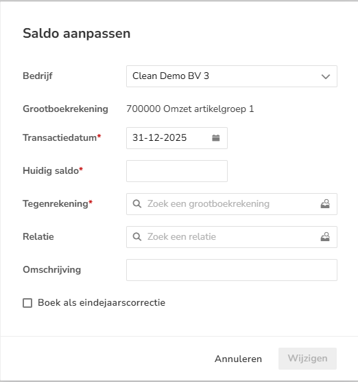 Voer het huidige saldo in, selecteer de juiste tegenrekening en klik vervolgens op de knop Wijzigen.