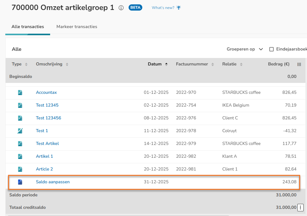 Je ziet nu dat het totaal debet- of creditsaldo van de grootboekrekening op 0,00 euro staat en er een diverse post is aangemaakt.