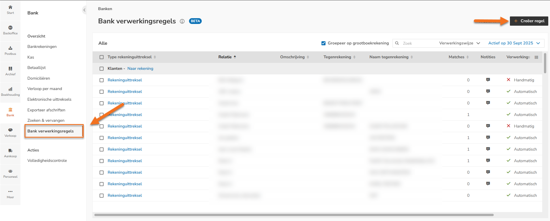 Open via het menu in de Bank het onderdeel Verwerkingsregels. Het volgende scherm wordt geopend: