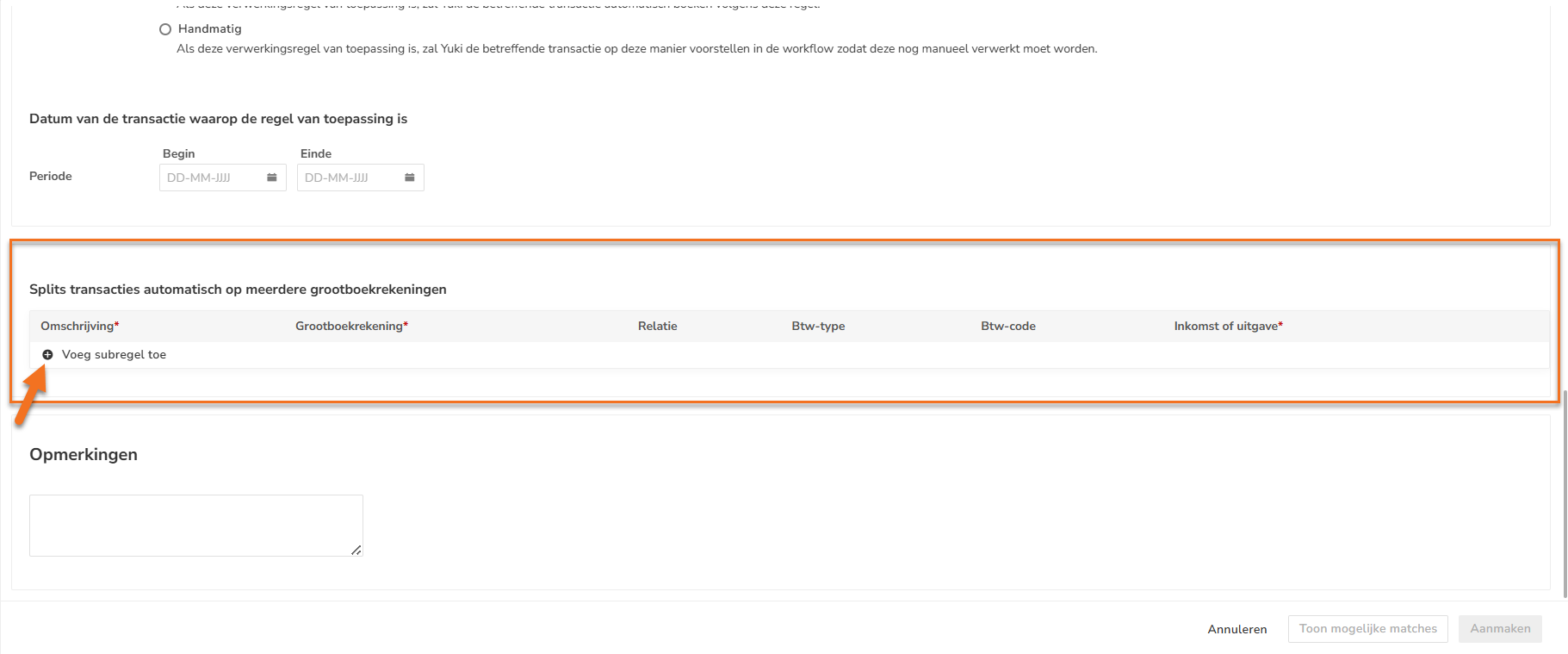 Om een nieuwe herkenningsregel aan te maken klik je bovenin je scherm op de knop +Creëer regel. Je komt dan terecht in het scherm om een normale herkenningsregel aan te maken. Onderaan zie je de volgende criteria om transacties te splitsen: