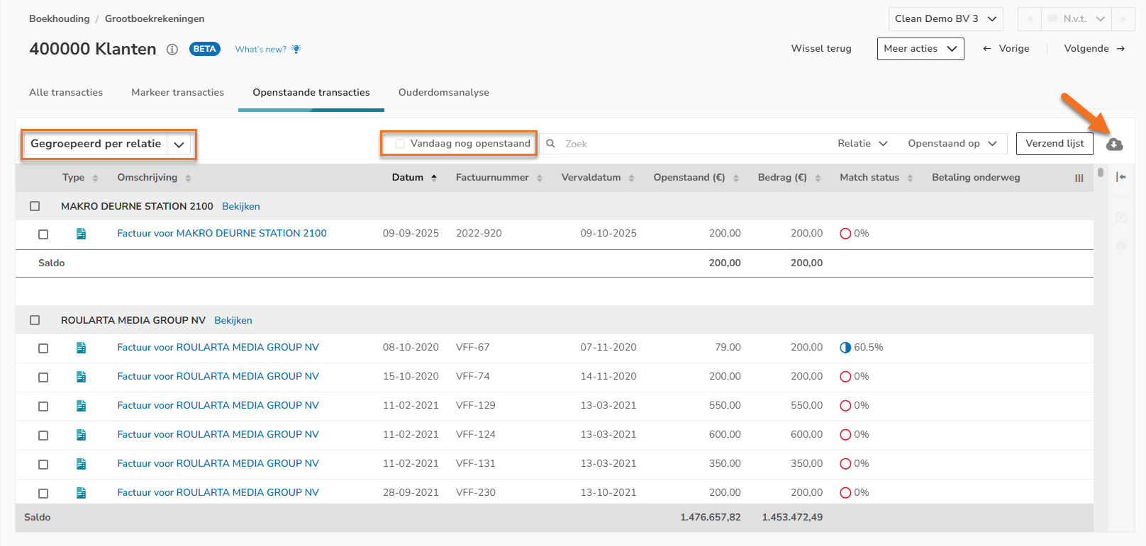 Je kan hier ook enkel de transacties aanduiden die vandaag nog open staan en in de zoekbalk filteren op relatie of datum.