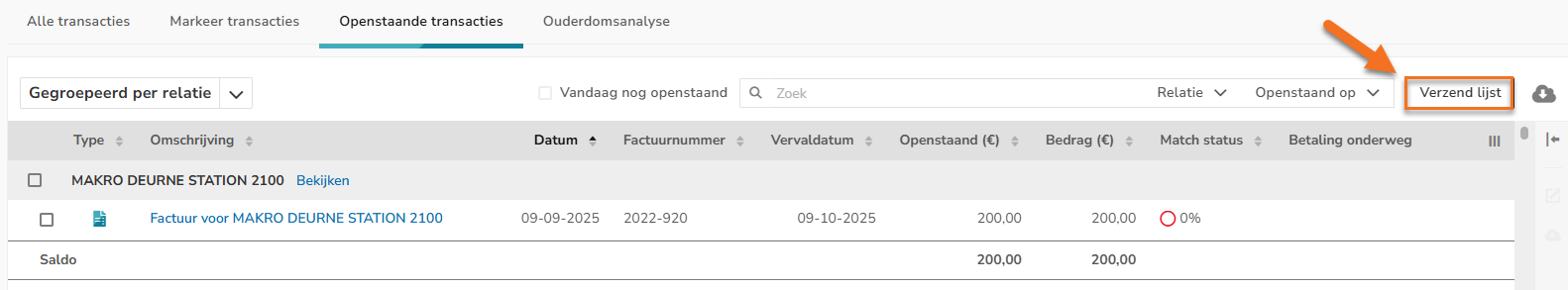 Om een lijst met openstaande posten naar de gebruiker te sturen, klik je op de knop Verzend lijst.