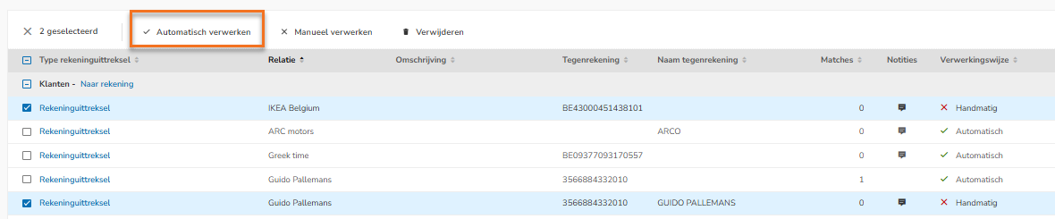 Selecteer de bank verwerkingsregels waarvan de banktransacties automatisch moeten worden verwerkt als aan alle criteria van de desbetreffende bank verwerkingsregels is voldaan. Klik vervolgens bovenin het scherm op Automatisch verwerken.