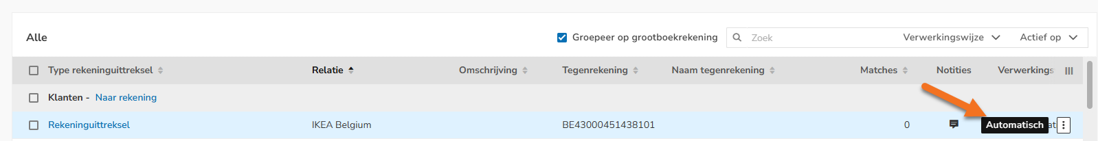 Om het automatisch verwerken van één bank verwerkingsregel in te schakelen, beweeg je met je muis boven de regel van de desbetreffende bank verwerkingsregel en klik je op de knop Automatisch.