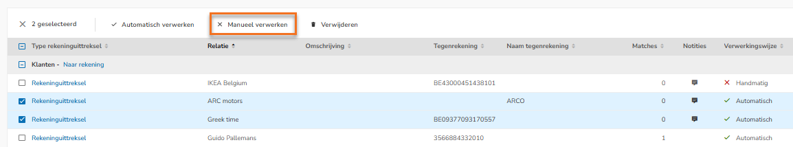 Selecteer de bank verwerkingsregels waarvan de banktransacties manueel moeten worden verwerkt als aan alle criteria van de desbetreffende bank verwerkingsregels is voldaan. Klik vervolgens bovenin het scherm op Manueel verwerken.