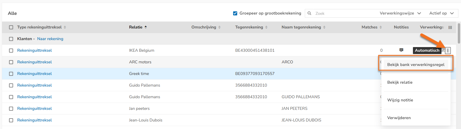 Beweeg met je muis boven de regel van de desbetreffende bankverwerkingsegel, klik op de knop met de drie puntjes en selecteer vervolgens Bekijk relatie in het dropdownmenu.