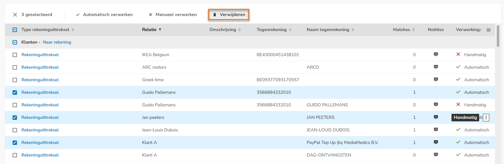 Selecteer alle bank verwerkingsregels die je wilt verwijderen en klik vervolgens bovenin het scherm op Verwijderen.