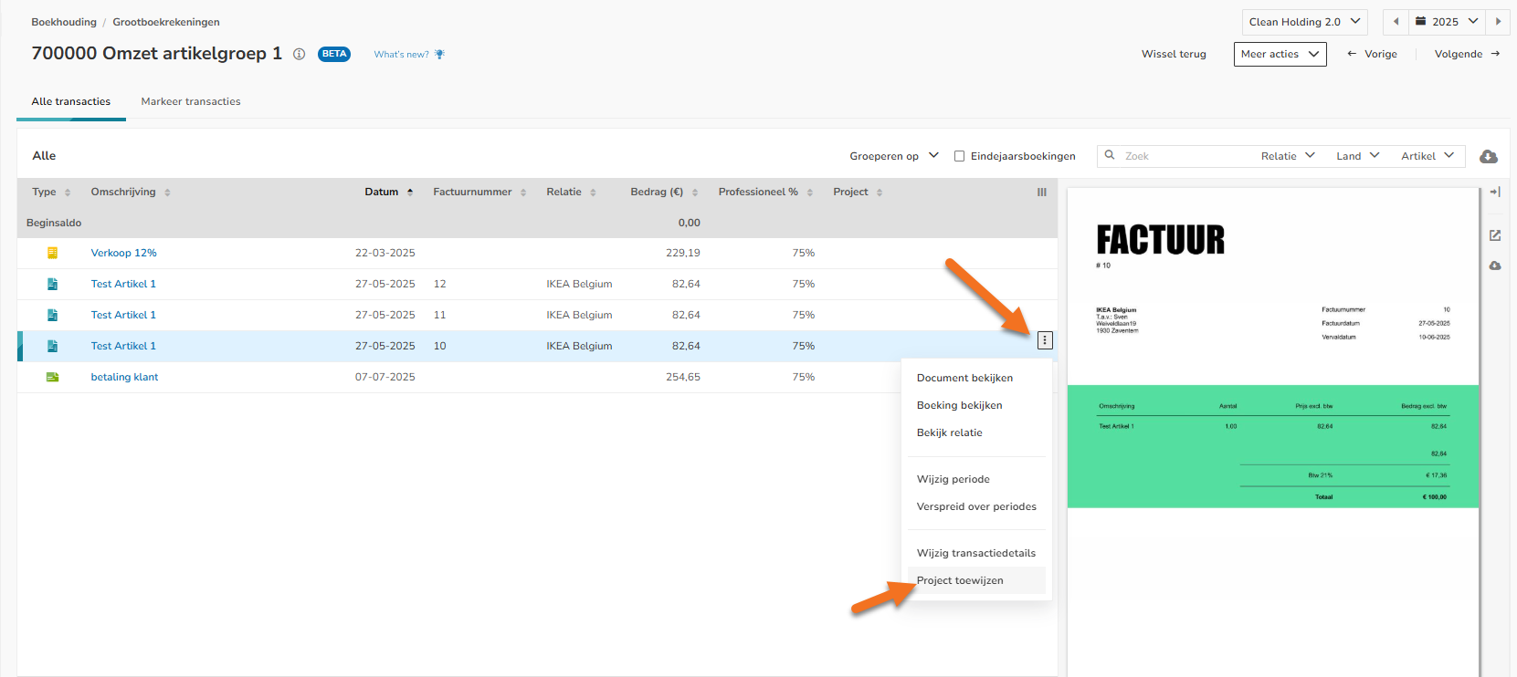 - Klik achter de desbetreffende transactie op de knop met de drie puntjes en selecteer in het nu geopende menu de optie Project toewijzen.