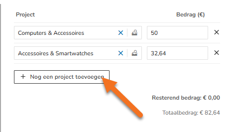 Indien je de transacties aan twee of meer projecten wilt toewijzen klik je op de knop +Nog een project toevoegen. Er wordt een tweede regel getoond waar je het restbedrag kunt toewijzen aan een ander project. Op die manier kun je een transactieregel opsplitsen en aan verschillende projecten koppelen.