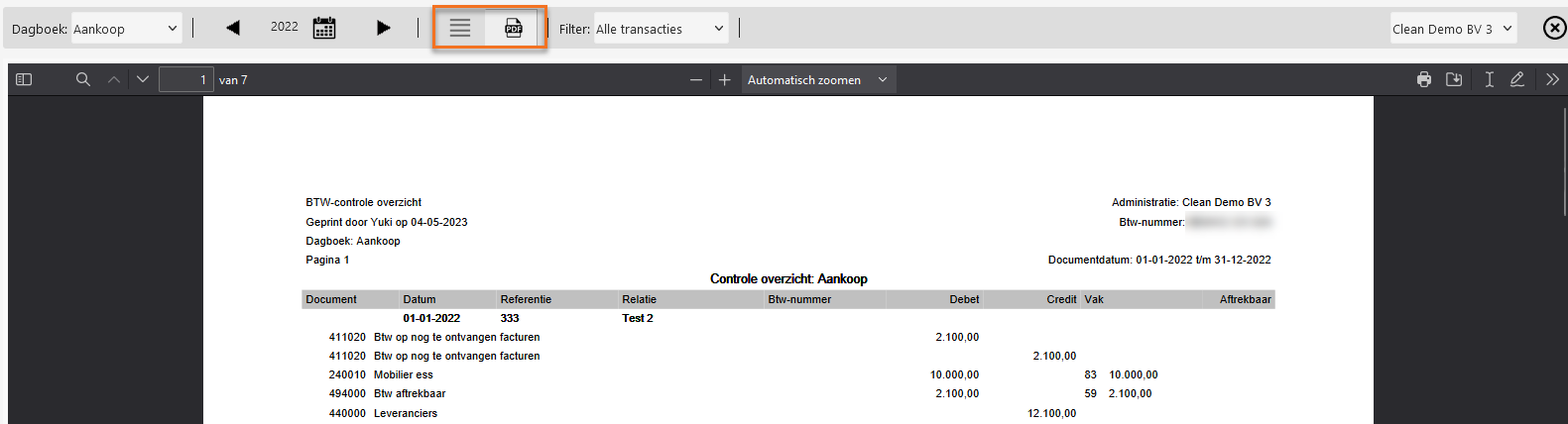 Hier krijg je een overzicht van alle boekingen per dagboek met aan de rechterkant een voorbeeld van het bijhorende document.