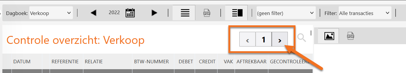 Per periode wordt standaard een maximum van 500 transactielijnen getoond. Via de pijltjes in het overzicht kan switchen tussen de verschillende pagina's om alle boekingen te kunnen controleren.