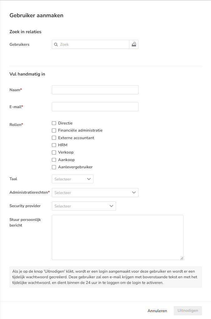 In een volgend scherm kan je de gebruiker aanmaken door achtereenvolgens de naam, e-mailadres, rol* en taal in te geven.