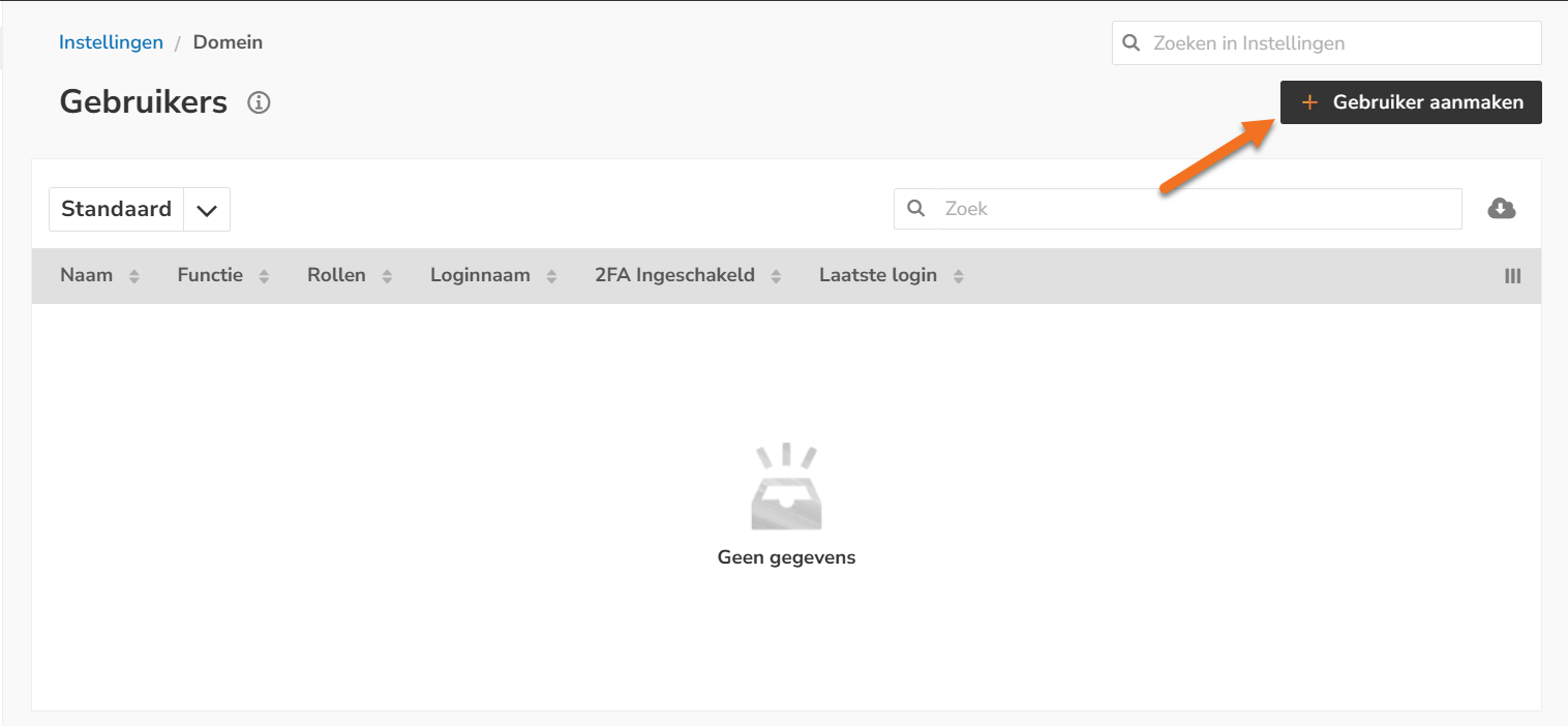 De eerste gebruiker kan perfect nog na de opstart van een domein aangemaakt worden door jou. Dit kan je doen door in het geopende domein op de knop +Gebruiker aanmaken te klikken.