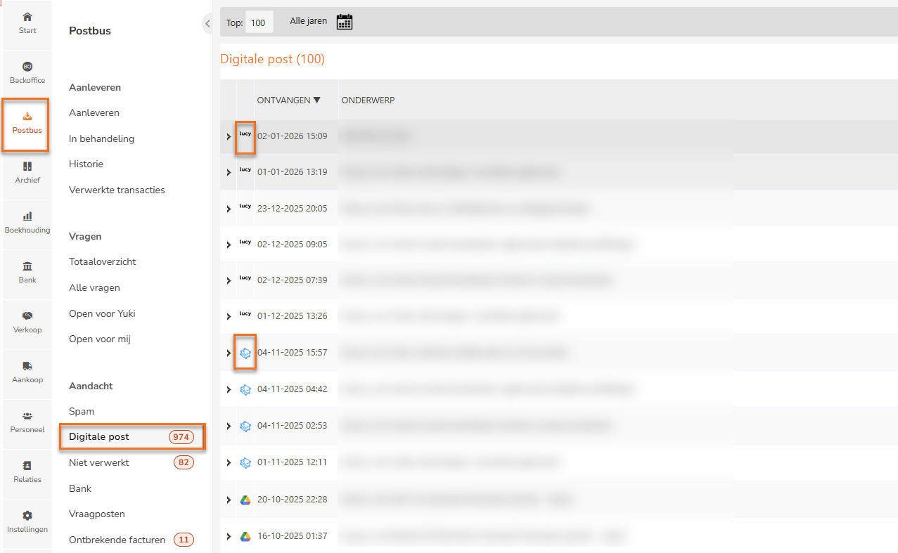 Wanneer de facturen via de de e-mailintegratie van Lucy zijn binnengekomen, dan krijgen deze niet het Lucy incoontje, maar toont Yuki het envelopje.