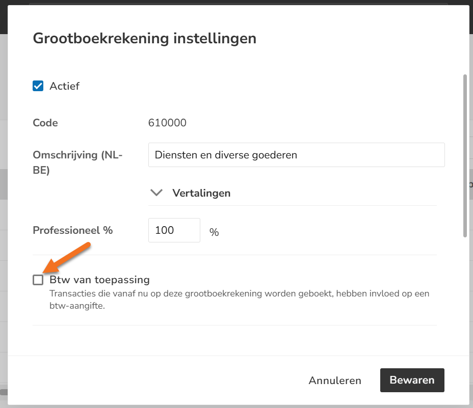 - Schakel BTW van toepassing uit voor alle kostenrekeningen in het MAR door bij de instellingen van de grootboekrekening het vakje uit te vinken.