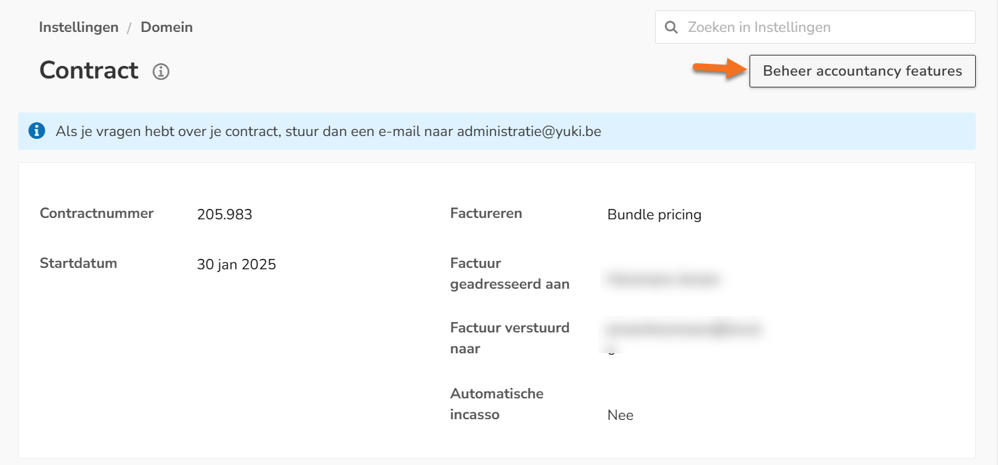 In het domein zelf heb je ook de mogelijkheid om deze toe te voegen via Instellingen > Contracten > Beheer accountancy features