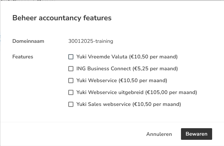 Aan een domein kunnen indien nodig één of meer van de onderstaande accountant features worden toegevoegd: