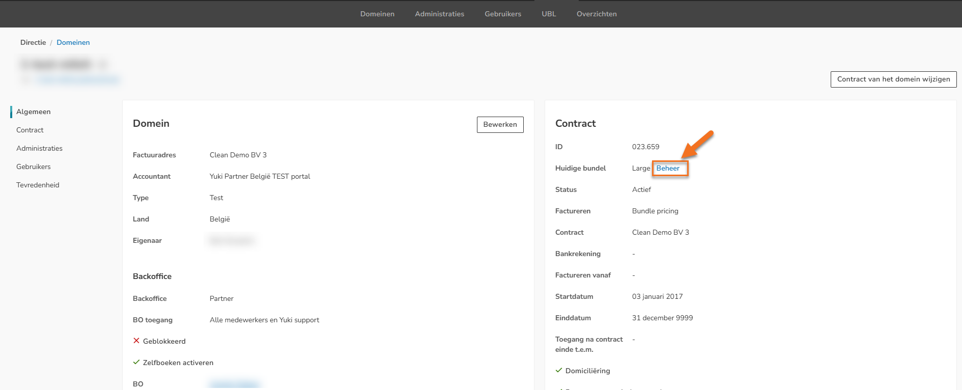 In het backoffice portaal klik je onder Beheer op Domeinen en vervolgens op de naam van het domein. Klik vervolgens op de link Beheer achter de huidige bundel van het domein.