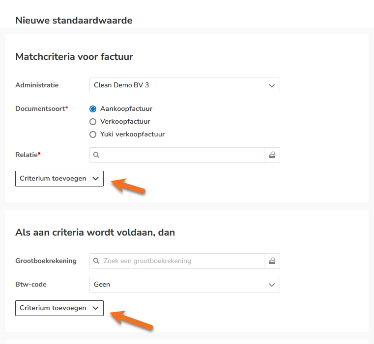 Er zijn enkele verbeteringen gedaan met betrekking tot de standaardwaarden en UBL-regels op domeinniveau. Deze nieuwe manier van het aanmaken van standaardwaarden en UBL-regels zorgt voor een duidelijkere en simpelere manier van automatisatie instellen op domeinniveau. In de nieuwe module is er meer overzicht gecreëerd voor de gebruiker die automatisatie instelt in het domein door verschillende criteria te verbergen onder de knop "Criterium toevoegen".