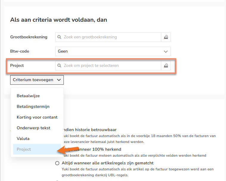 - Nieuw veld Accounting Cost Code als input om het te koppelen aan een grootboekrekening in YukiMogelijkheid om Project automatisch toe te wijzen op factuurregel