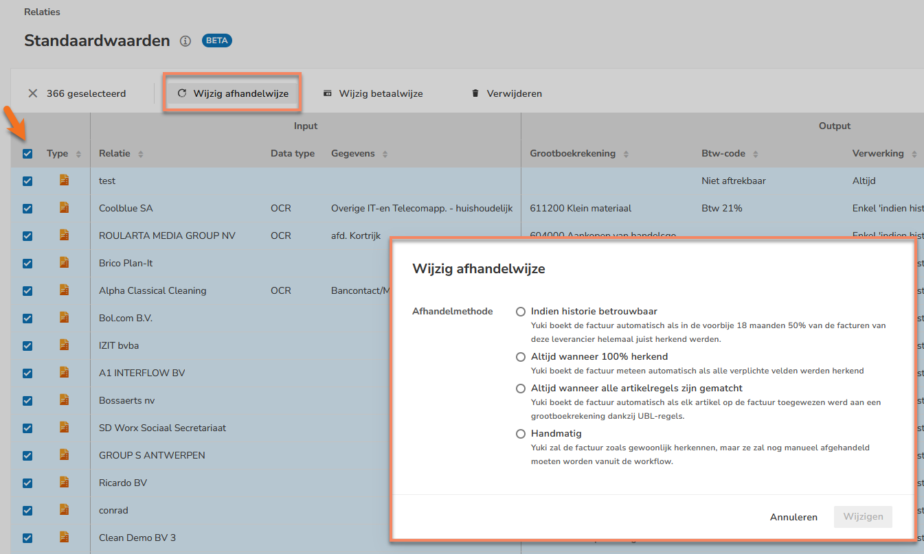 Met deze nieuwe update kan je ook in bulk je afhandelmethode wijzigen. Extra efficiënt in het UBL-tijdperk om te gaan voor ‘Altijd wanneer 100% herkend’ of ‘Altijd wanneer alle artikelregels zijn gematcht’.