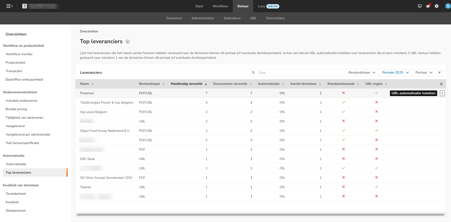 Deze pagina kan je bereiken door in het portaal te klikken op de knop 'Stel regels in' in de tegel 'Verhoog je automatisatie' of via Beheer > Overzichten > Top leveranciers.