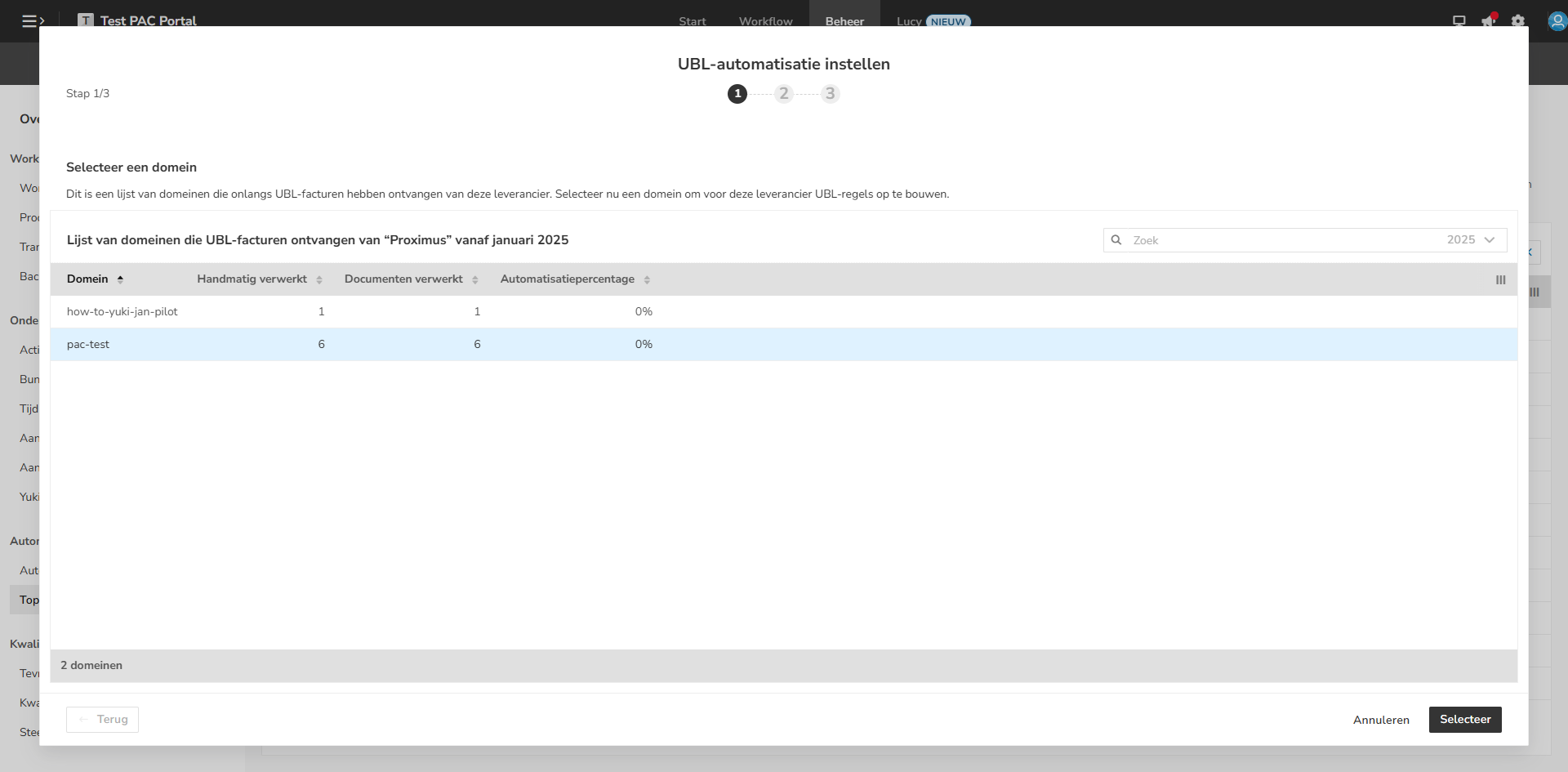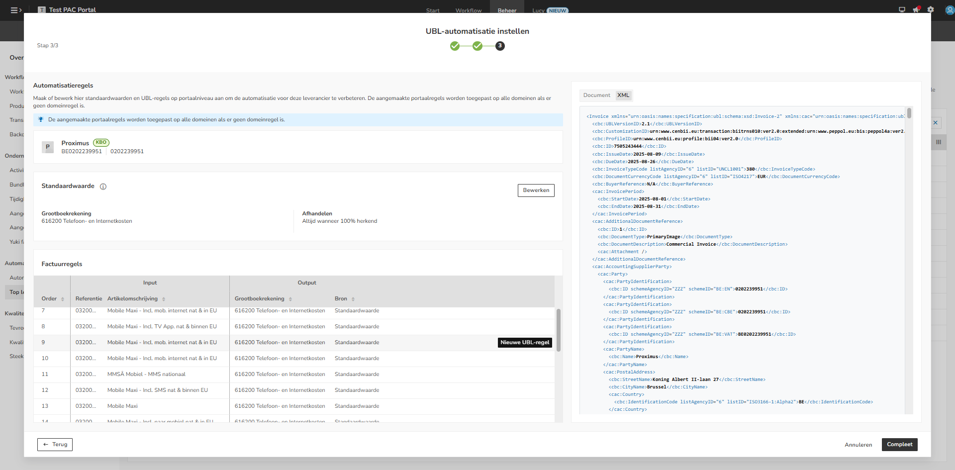 Vanuit dit overzicht kan je op een efficiënte manier UBL-regels instellen. Je start vanuit een factuur in een domein, maar maakt de automatisatieregels op portaalniveau aan zodat deze gelden voor alle domeinen, tenzij er domeinspecifieke regels aanwezig zijn. De gecreëerde standaardwaarde en UBL-regels vanuit dit overzicht zijn steeds terug te vinden onder de Instellingen > Standaardwaarden op portaalniveau.