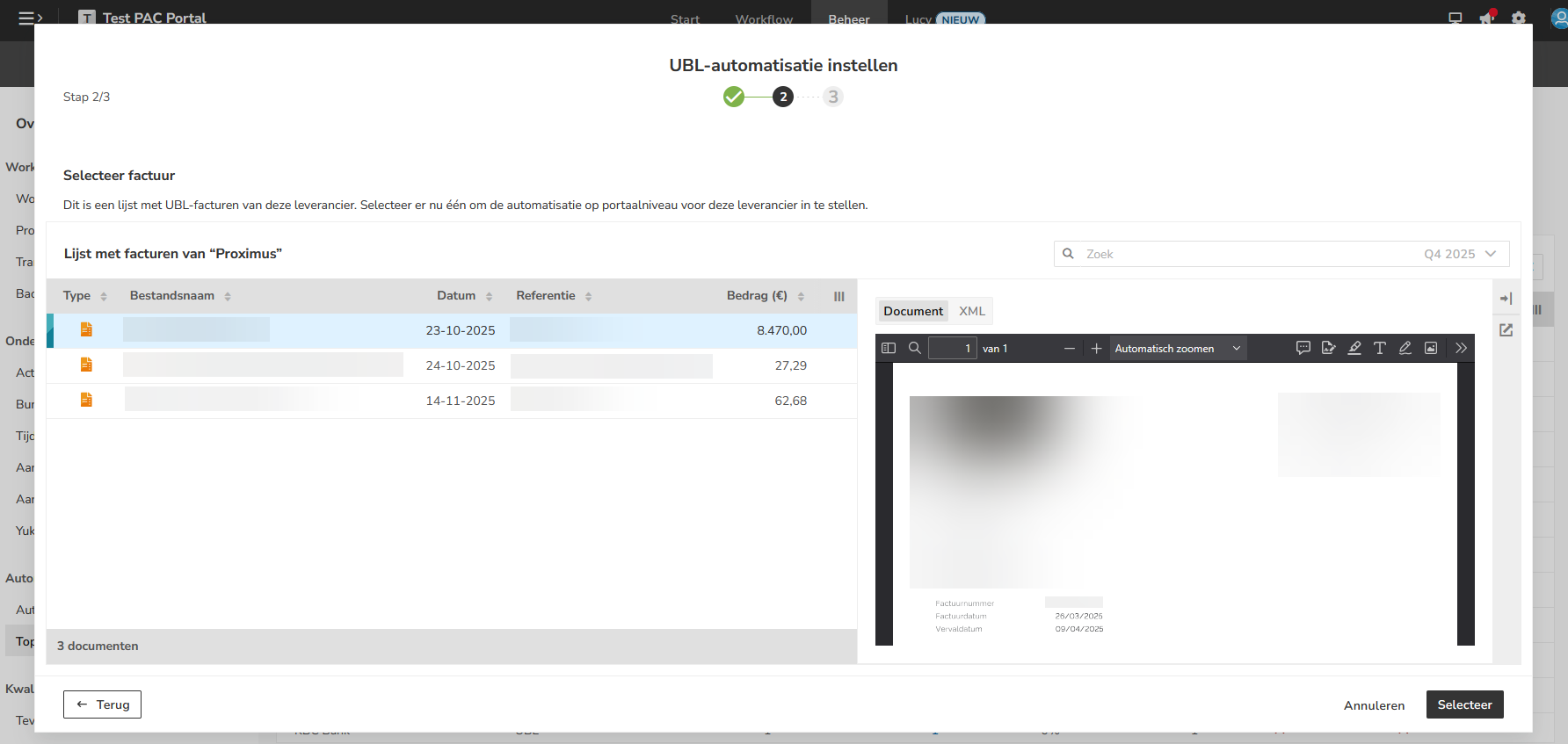 Kies de specifieke UBL-factuur uit de lijst van UBL-facturen die van de leverancier zijn ontvangen. Je ziet hier de reeds verwerkte facturen van het domein staan. Dit overzicht wordt elke avond geüpdatet, dus facturen verwerkt op de middag in een domein, zullen hier pas 's avonds terug te vinden zijn.