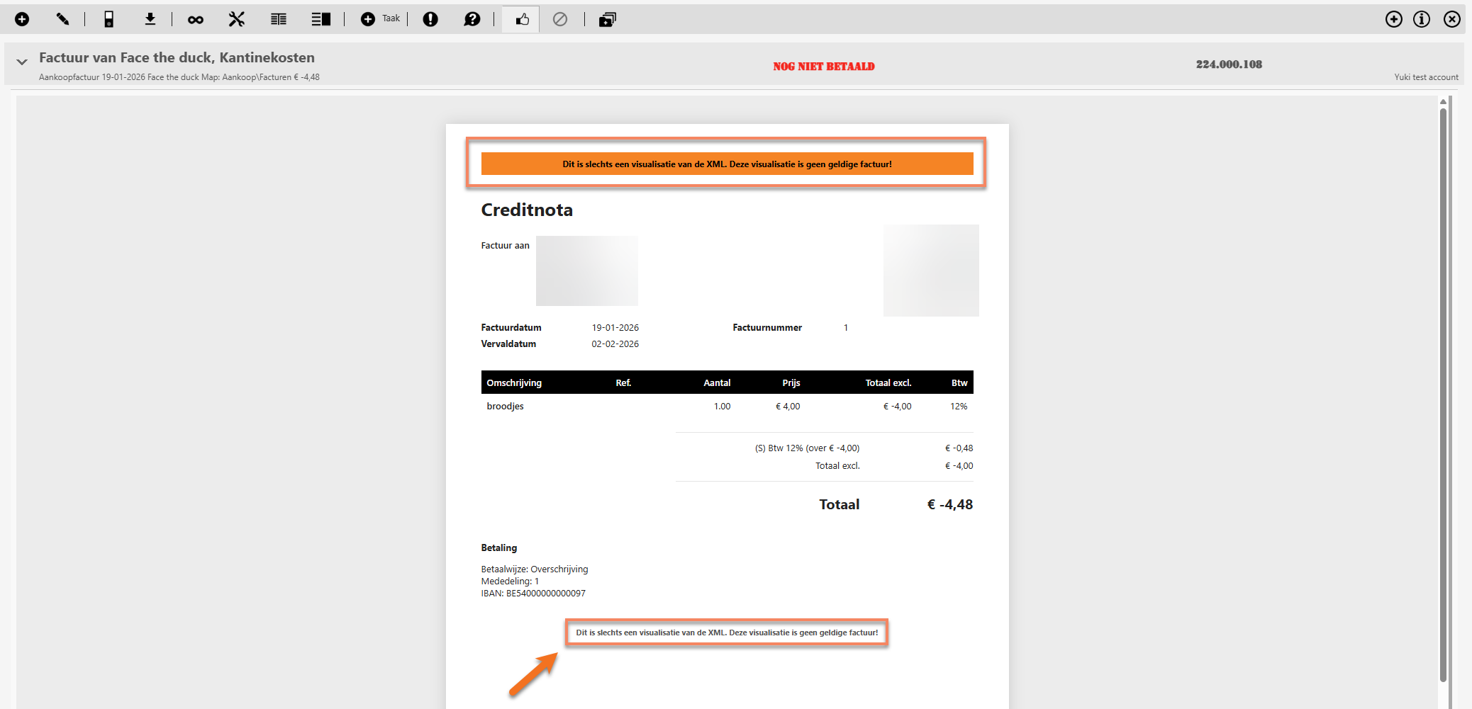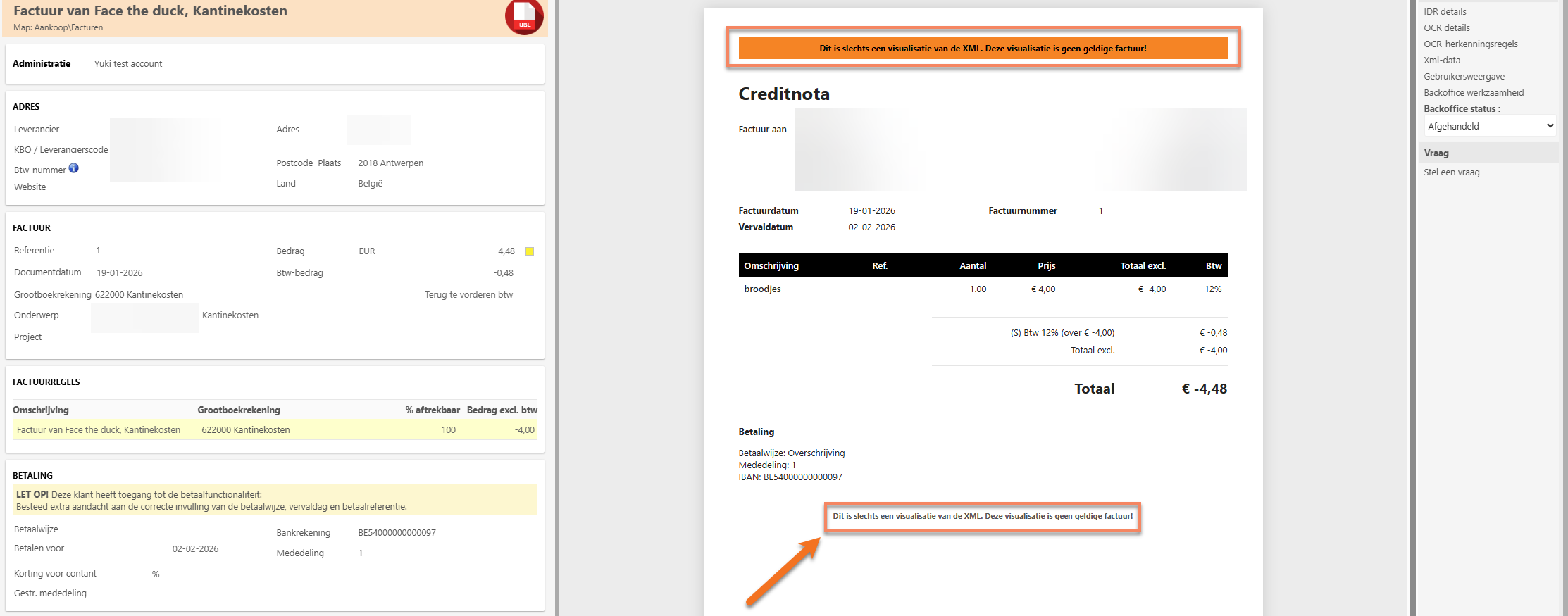 Om dit probleem te verhelpen, heeft Yuki een zogenaamde mock-up PDF geïmplementeerd, waardoor de inhoud van de UBL-factuur in de software zichtbaar is. Deze zal de belangrijkste en verplichte gegevens bevatten, maar blijft beperkt omdat niet alle mogelijke Peppol-velden kunnen worden weergegeven en omdat bedrijfsspecifieke of uitzonderlijke elementen kunnen ontbreken.